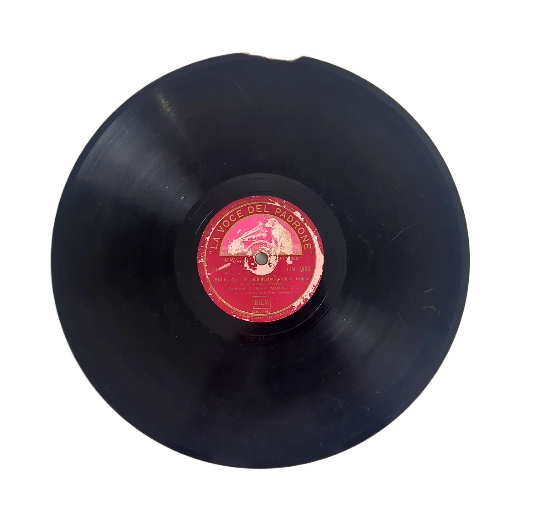 Italienische Schellackplatte des Labels La Voce del Padrone (italienische HMV-Niederlassung) mit vokalem Repertoire zwischen Oper und Unterhaltungsmusik.