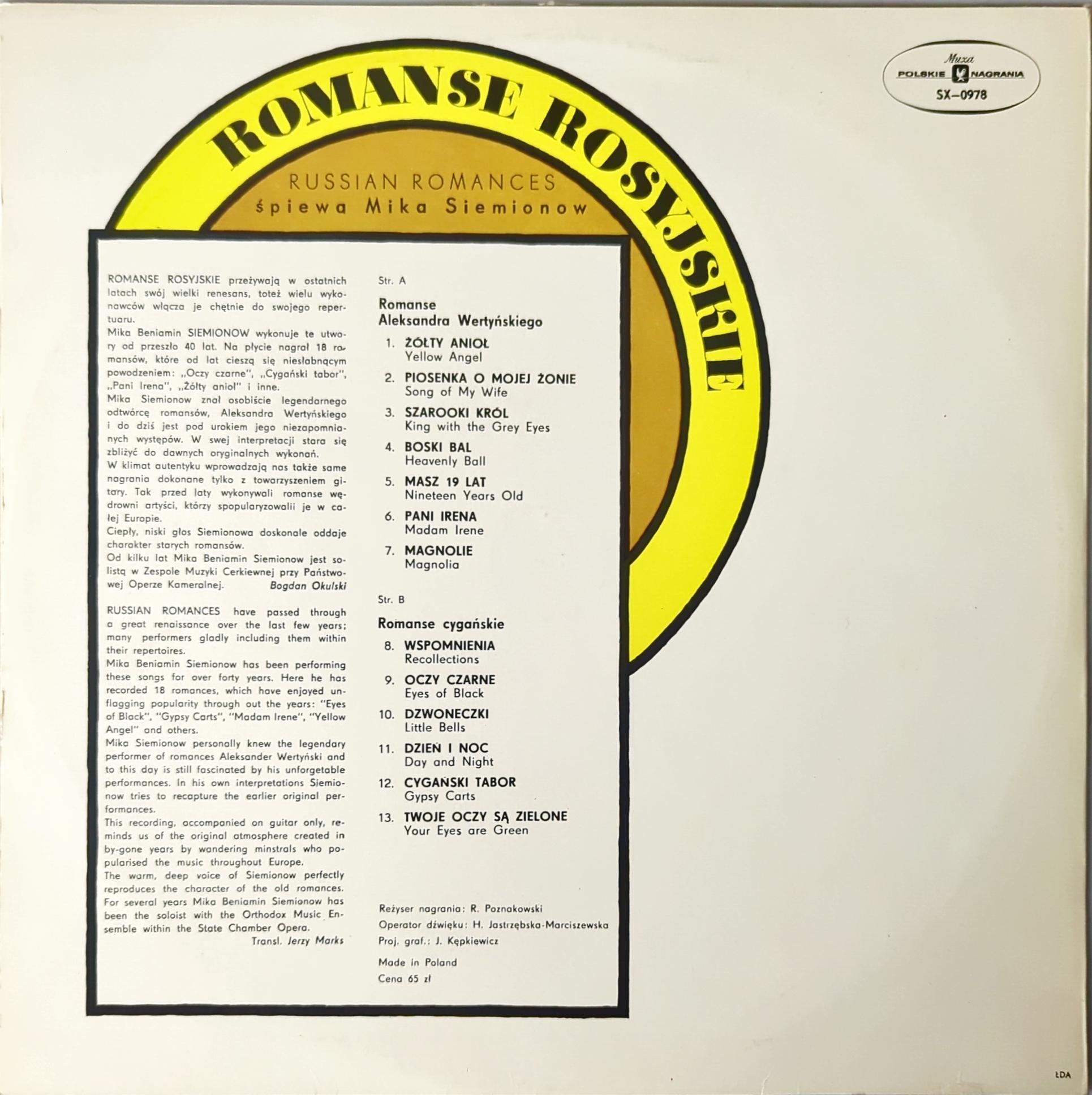 Mika Siemionow Romanse Rosyjskie - Śpiewa Mika Siemionow LP SX0978 VG