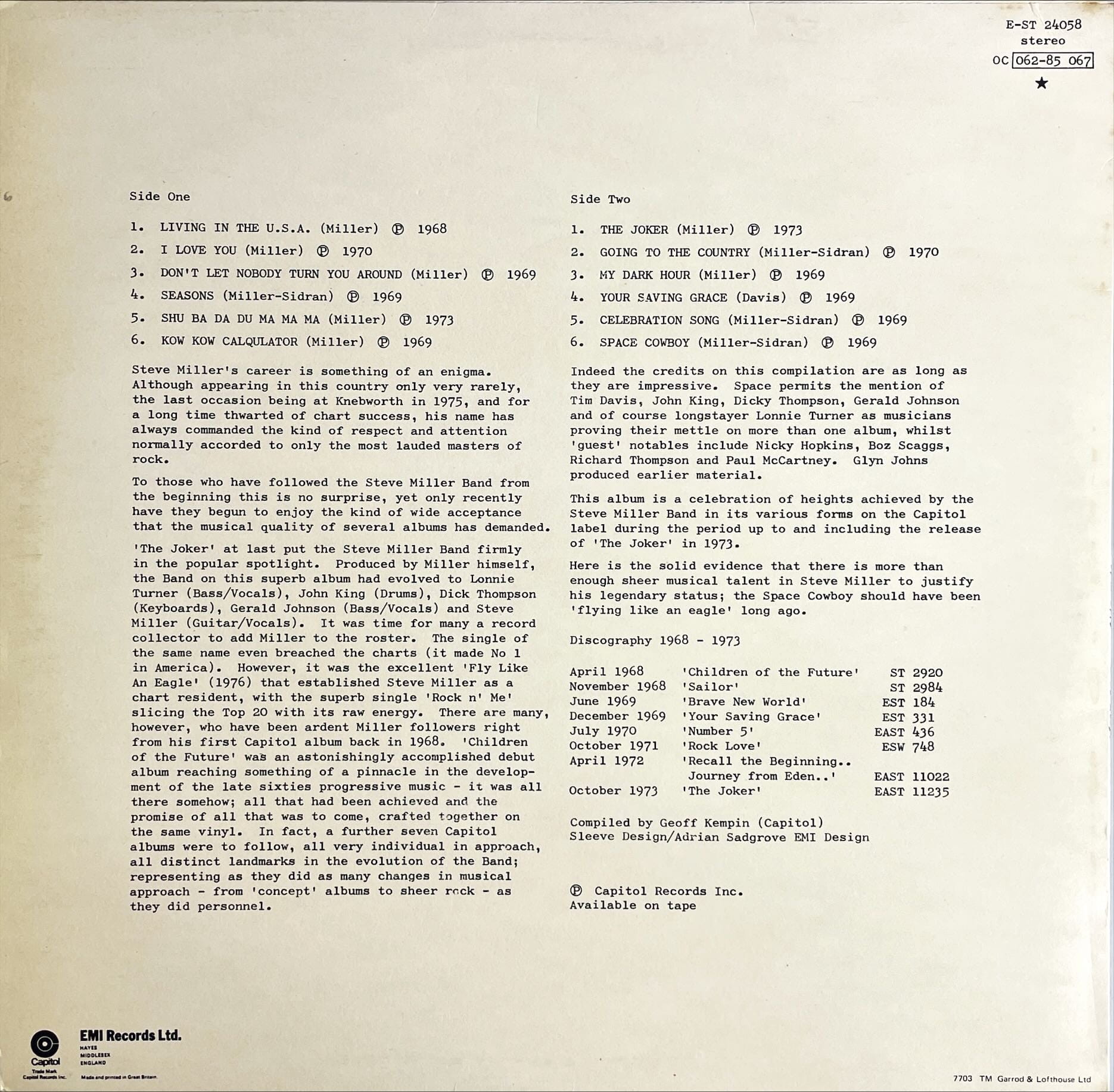 Steve Miller The Best Of Steve Miller LP EST24058 EX